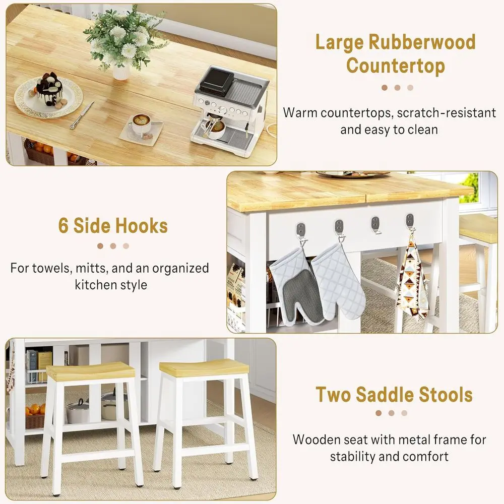 Kitchen Island with Storage and Seating Include 2 Bar Stools, 47" Solid Rubberwood Top Kitchen Island with Trash Can Storage