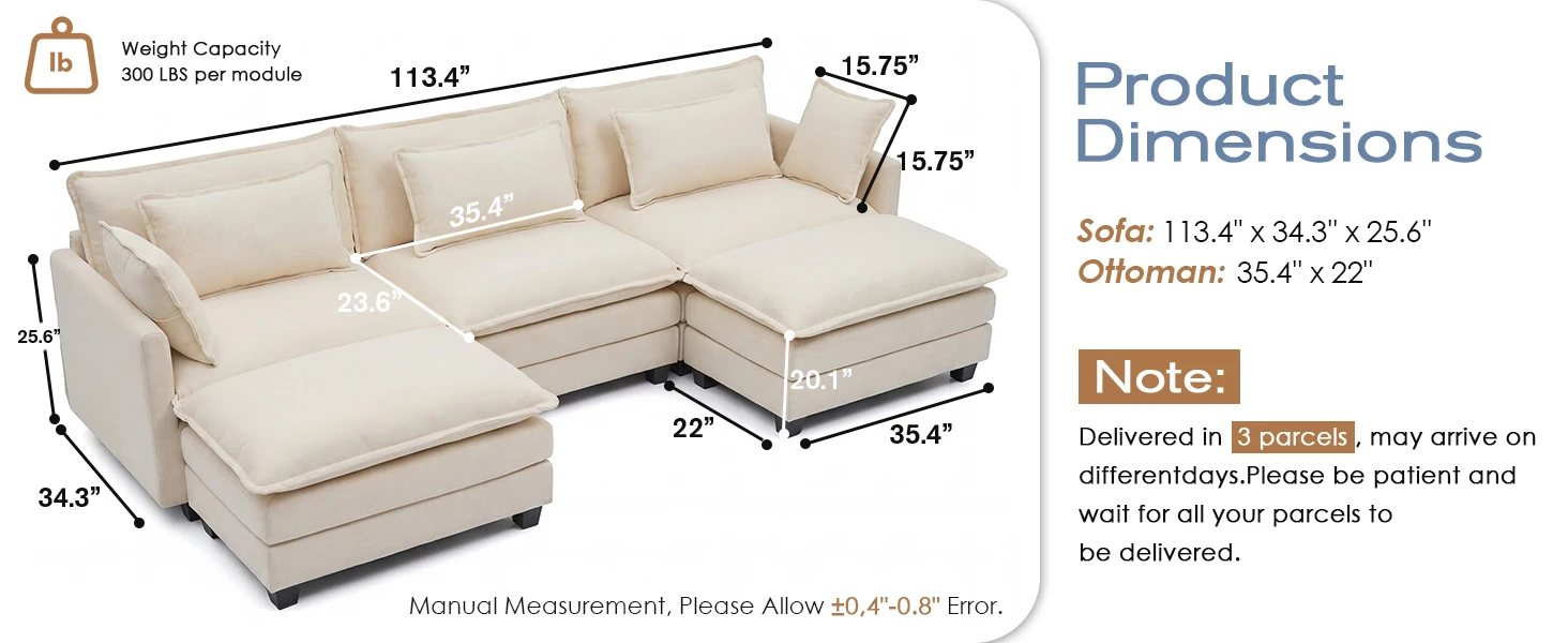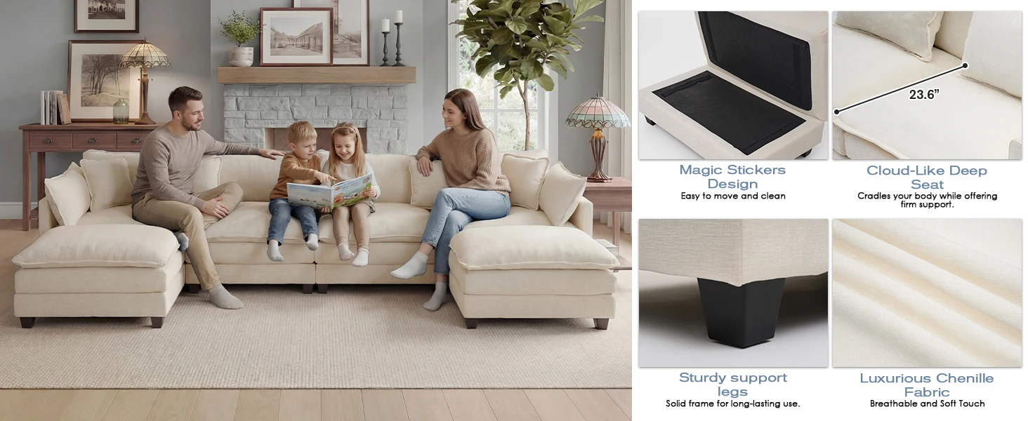 【Spacious 3 or 4 Seat Capacity】 113.4" U-shaped design with 23.6" deep seat, comfortably seating 4 adults for family gatherings or entertaining guests.