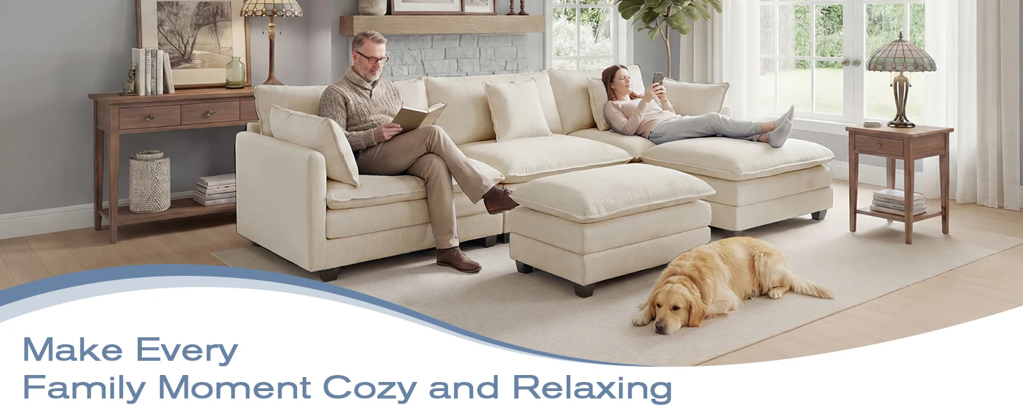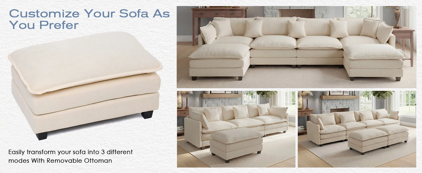 Redlife 113.4" Modular Sectional Sofa with Ottoman, Comfy Cloud Couch with Deep Seat (23.6" D), Solid Wood Frame,for Living Room